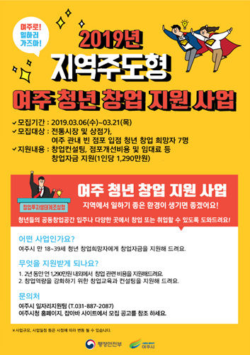 여주시(시장 이항진)는 지역주도형 청년 일자리창출 사업의 일환으로 추진하는 ‘2019년 여주 청년 창업지원 사업’대상자 모집기간을 연장(2차)한다.