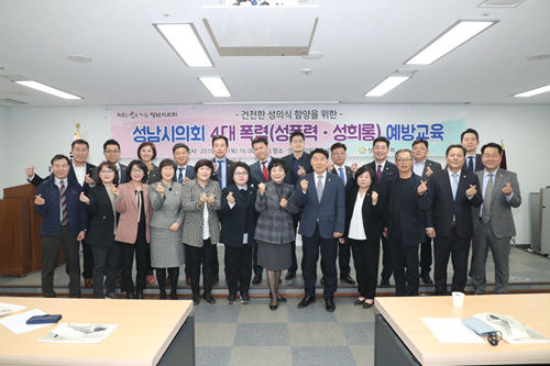 성남시의회(의장 박문석)는 7일 시의회 세미나실에서 시의원과 의회사무국 직원을 대상으로 ‘명사초청특강 및 4대 폭력 예방교육’을 실시했다.