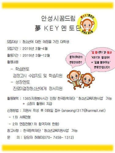 몽키(夢KEY) 대학생 멘토단 모집에 관한 자세한 사항은 안성시학교밖청소년지원센터 꿈드림(070-7458-1312)으로 문의하면 된다.