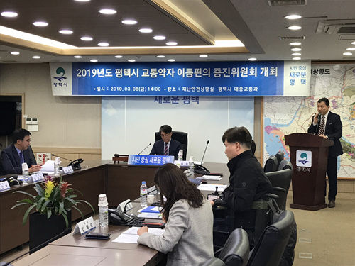 평택시(시장 정장선)는 지난 8일 교통약자 특별교통수단(장애인콜택시) 이용자의 이동편의 증진과 차량이용 편의 제공을 위해 ‘교통약자 이동편의 증진위원회’를 개최했다.