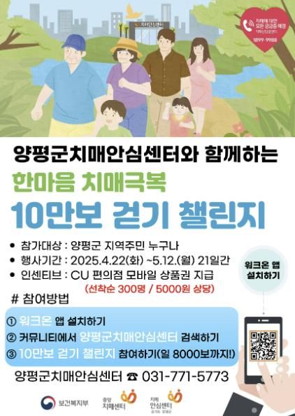 행사는 비대면으로 진행되며, 참여를 희망하는 자는 모바일 앱 ‘워크온(WalkOn)’을 설치한 후, 양평군 치매안심센터에 가입하고 ‘한마음 치매극복 10만 보 걷기 챌린지’에 참여하면 된다. 참여자는 행사 기간 동안 하루 최대 8,000보, 총 10만 보 달성을 목표로 걷기에 참여하게 된다. 목표를 달성한 참여자 중 선착순 300명에게는 소정의 상품권이 지급될 예정이다.