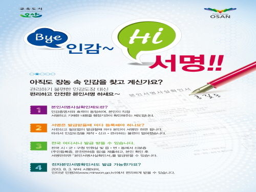 시는 현행 인감제도는 인감도장을 제작· 관리하고 사전에 주소지에서 신고를 해야 하는 불편함과 대리발급으로 인한 사고위험성이 높아 사전 등록절차 없이 전국 어디서나 발급 가능하며 본인외 발급이 불가능하므로 사고위험이 없어 편리하고 안전하다는 장점을 지닌 본인서명사실확인서 이용을 적극 홍보하기 위해 전단지를 제작했다.