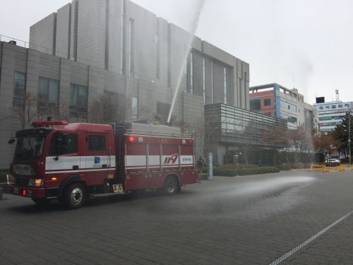 훈련은 구청사 3층에서 실제 화재가 난 상황을 가정해 직원들로 구성된 자위소방대가 청사 내 직원과 민원인을 빠르게 대피시킨 후 부상자를 이송하고 소방차가 출동해 화재를 진압하는 순서로 진행됐다.