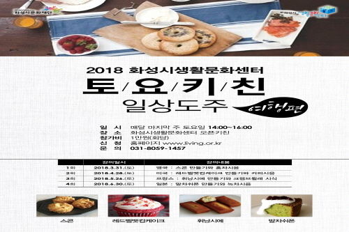 화성시생활문화센터는 오는 3월 31일(토)부터 6월 30일(토)까지 총 4회에 걸쳐 상반기 오픈키친 프로그램 「토요키친」 을 진행한다.