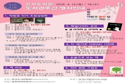 안성시립진사도서관은 제54회 도서관주간 및 2018 책의 해를 맞아 “오늘은 책 읽기 좋은 날, 도서관 가는 날” 을 주제로 4월 한 달간 다양한 독서프로그램을 마련했다.