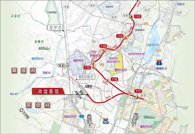 기본계획에 따르면 사업 전체 연장 39km 중 8km가 화성시에 위치하고, 이 구간에 가칭 삼성전자역, 능동역, 메타폴리스역, 동탄역, 서동탄역 5개 역사가 설치된다.