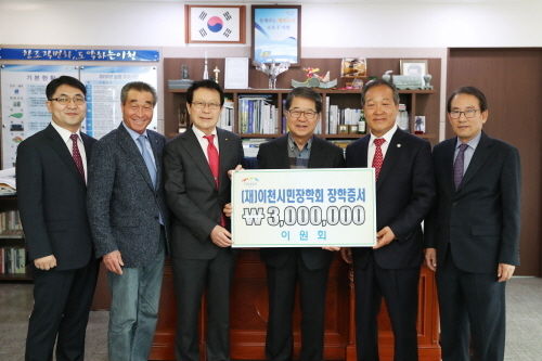 이천시(시장 조병돈)는 29일 이원회(회장 최재문)에서 지역인재 육성을 위한 장학기금 3백만 원을 전달했다고 밝혔다.