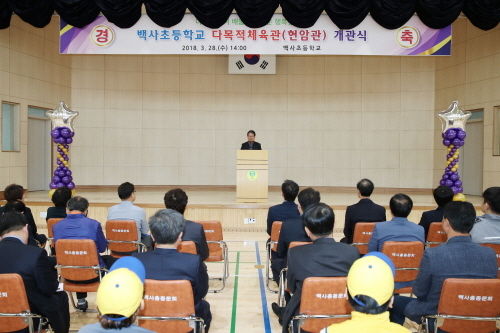 2018. 3. 28. 백사초등학교에서 학부모와 학생 기관·단체장 80여명이 참석한 가운데 백사초등학교 개방형 다목적체육관(현암관) 개관식이 개최되었다.