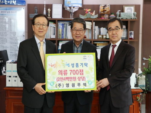 한편 2014년부터 매년 의류를 기탁해 오고 있는 (주)영원무역은 이번에도 의류 700점 (2천4백만 원 상당)을 기탁해 저소득층의 옷 걱정을 덜어주는 등 꾸준한 나눔의 모범이 되고 있다.