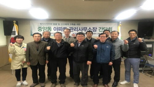 중앙동장은 “최근 경기불황의 장기화 등의 여파로 사업실패, 실직(업), 중한질병 등의 위기상황에 처한 아파트 거주세대의 복지사각지대 발생 우려가 높아졌다”며 “소외되고 방치되는 어려운 주민이 없도록 복지사각지대 신고체계에 아파트관리사무소의 적극적인 협조와 관심을 당부드린다”고 말했다.