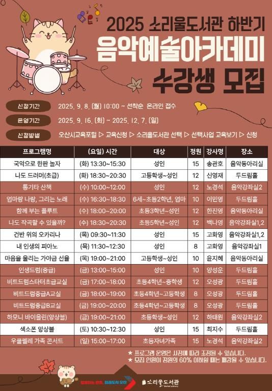 (중부시사신문) 경기도 오산시 소리울도서관은 시민들이 음악의 즐거움을 직접 체험할 수 있는 『2025 소리울도서관 하반기 음악예술아카데미』를 운영하며, 오는 9월 8일부터 수강생을 모집한다고 밝혔다.