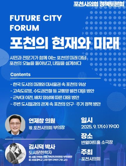 이번 토론회는 급변하는 수도권 환경 속에서 포천의 현안을 짚어보고 미래 발전 방향을 모색하기 위해 마련된 자리로, 포천 시민과 전문가, 의회가 함께하는 열린 논의의 장이 될 예정이다.