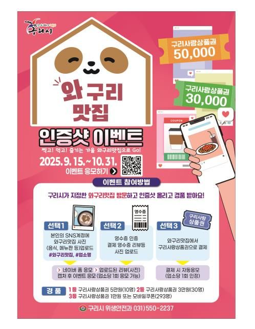 백경현 구리시장은 “이번 이벤트는 시민과 함께하는 참여형 캠페인으로, 가을철 지역 음식문화 활성화에 실질적인 활력을 불어넣을 것으로 기대된다”라며, “앞으로도 와구리맛집을 중심으로 구리만의 맛과 멋을 널리 알리는 다양한 정책을 추진하겠다”라고 말했다.
