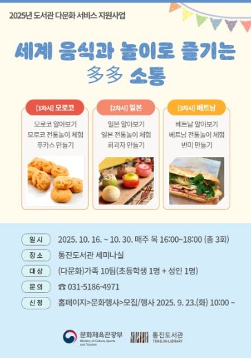 프로그램 신청은 9월 23일 오전 10시부터 통진도서관 누리집을 통해 온라인으로 이루어지며, 다문화가족 등 10팀(초등학생 1명과 성인 1명)을 선착순으로 모집한다.