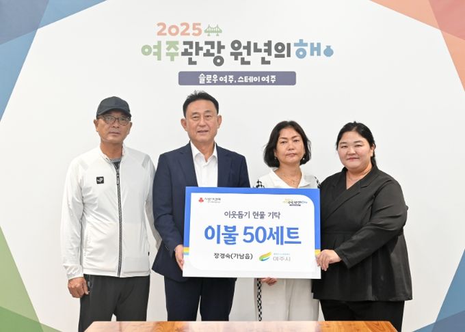 (중부시사신문) 지난 19일 장경숙(가남읍 주민)님은 여주시청을 방문하여 여주시 저소득층을 돕기 위한 후원품으로 이불 50세트(175만원 상당)를 기탁했다.