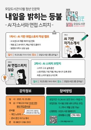 (중부시사신문) 김포시 모담도서관에서 생성형 인공지능을 활용해 자기소개서 및 면접 스피치를 준비해볼 수 있는 청년 대상 프로그램을 10월 25일 오전 11시부터 총 2차시에 걸쳐 운영한다.