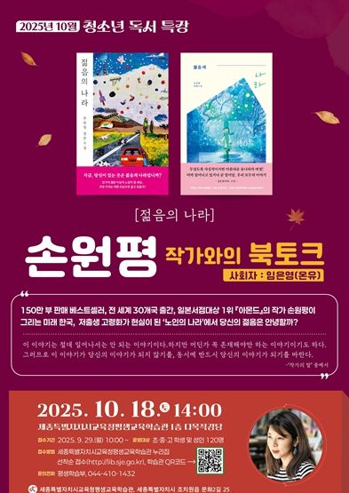 (중부시사신문) 세종특별자치시교육청평생교육학습관이오는 10월 18일 14시, 소설가이자 영화감독인 손원평 작가를 초청해 책마당(북콘서트)를 개최한다.