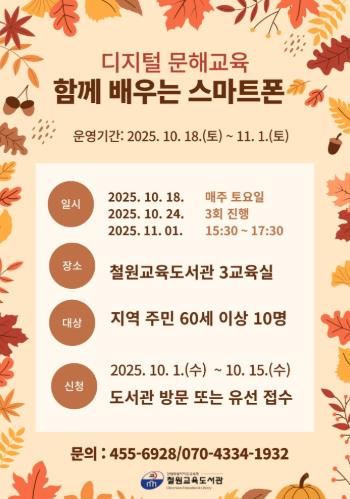 (중부시사신문) 철원교육도서관은 지역 고령층의 디지털 활용 능력 향상과 격차 해소를 위해 오는 10월 18일부터 11월 1일까지 매주 토요일, 총 3회에 걸쳐 ‘함께 배우는 스마트폰’ 디지털 문해교육을 운영한다.
