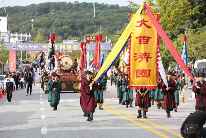 대형 백제기를 선두로 펼쳐지는 깃발 행렬은 올해 프로그램의 백미로 꼽힌다.