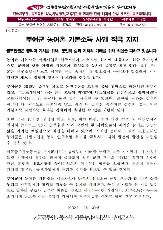 (중부시사신문) 전국공무원노동조합 부여군지부는 지난 9월 30일 의견문을 통해, 부여군이 추진 중인 농어촌 기본소득 시범 사업을 적극적으로 지지하며, 군민과 함께 공모사업 유치에 최선을 다하겠다는 뜻을 밝혔다.