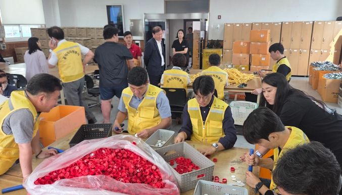 자원봉사에 참여한 직원들은 익숙하지 않은 작업이었지만 장애인생산품 조립과 포장을 도우며 구슬땀을 흘렸다.