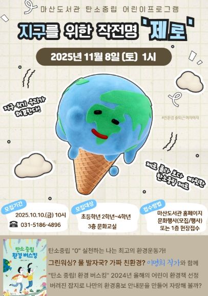 (중부시사신문) 김포시 마산도서관에서 오는 11월 8일 오후 1시부터 3시까지, 초등학교 2학년~4학년 어린이를 대상으로 탄소중립 어린이 프로그램 책풍당당 '지구를 위한 작전명 ‘제로’'를 운영한다.