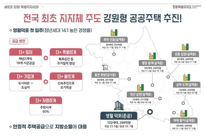 (중부시사신문) 강원특별자치도는 청년과 신혼부부 등 지역 정착 인구 확대를 위한 안정적인 주택공급을 목표로 전국 최초의 지자체 주도형 주거모델인 강원형 공공주택 사업을 적극 추진하고 있다고 밝혔다.