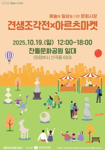 첫 번째는 10월 19일 12시부터 18시까지 잔돌문화공원(산곡동 693)에서 열리는 '견생조각전×아르츠마켓'이다. 의정부문화재단과 고산주민자치회가 공동 기획한 이 행사는 '비어 있던 풍경, 견생조각전(見生彫刻展)으로 채우다 - 고산동 작은 영웅들과 함께하는 어울림 한마당'으로 진행된다. 20여 개의 아르츠마켓 부스는 물론, 야외 조각전시와 다채로운 공연이 더해져 시민들에게 문화 향유의 폭을 넓힐 것으로 기대된다.