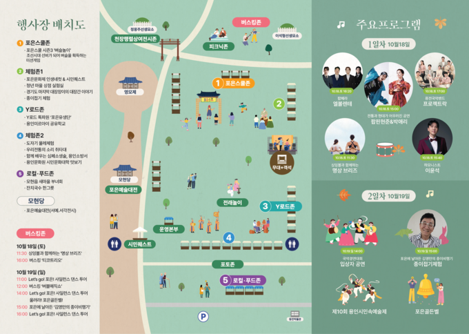 주요 공연 프로그램으로는 팝페라 그룹 엘블렌테, 퓨전국악밴드 프로젝트락, 팝핀현준·박애리 부부의 전통·현대 융합공연 등이 출연해 축제의 품격과 흥을 더한다. 둘째 날에는 용인시 민속예술제, 전국청소년국악경연대회 입상자 공연, 김영만의 종이비행기 체험이 이어져 전통과 현대가 조화를 이루는 무대를 선보인다.