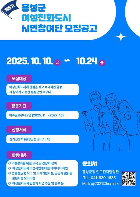 홍성군은 이번 시민참여단 모집을 통해 여성친화도시로서의 비전을 구체화하고, 군민 참여를 기반으로 한 실질적인 변화와 발전을 도모할 계획이다.