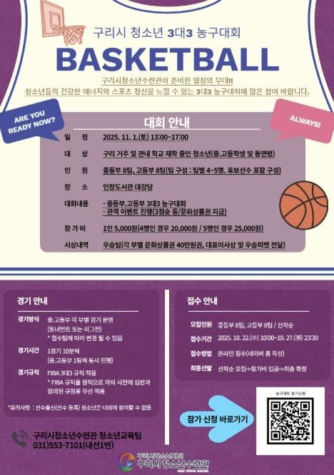 (중부시사신문) 구리시청소년재단 청소년수련관은 '2025 구리시 청소년 3대3 농구대회' 참가 신청을 10월 22일부터 10월 27일까지 온라인으로 신청받는다고 밝혔다.