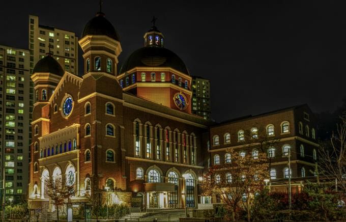 ‘광교1동성당(이의동 1371)’은 외국 관광지에서 만날 법한 모습으로 아파트 숲 사이를 변주하며 신도시의 디자인을 한층 세련되게 만든다. 성당 외관은 서양의 전통적인 건축 요소인 돔과 아치를 현대적으로 간결하게 디자인해 아름다움을 더했다. 특히 돔 형식으로 구현한 성전의 공간감, 천장에 투사되는 스테인드글라스의 빛, 이웃에 개방된 광장 등이 종교 건축물로서의 가치를 높인다.