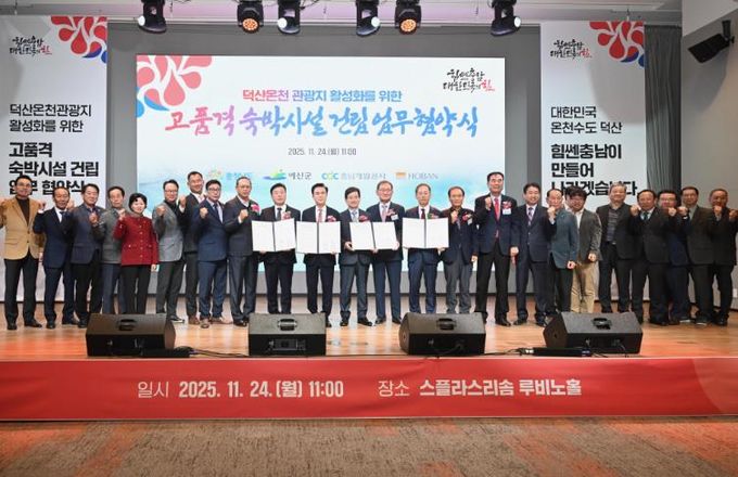 예산군수는 “이번 협약을 계기로 덕산온천관광지의 체류형 관광 기반이 한층 강화될 것으로 기대한다”며 “고품격 숙박 및 컨벤션 인프라 구축을 통해 예산 및 충남 지역의 관광환경을 개선하고 지역 경제활성화에 크게 기여할 것으로 확신한다”고 밝혔다.