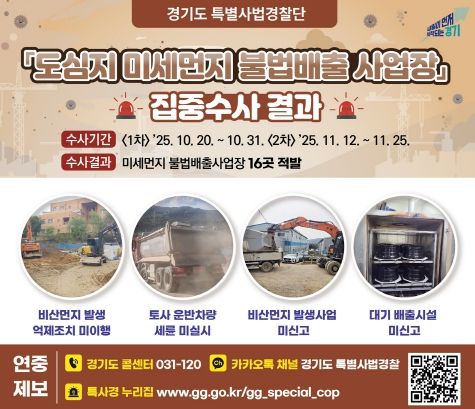 (중부시사신문) 경기도는 도심지 미세먼지 발생사업장 330개를 대상으로 불법 배출 행위를 집중 수사해 대기환경보전법 위반 사업장 16개를 적발했다고 9일 밝혔다.