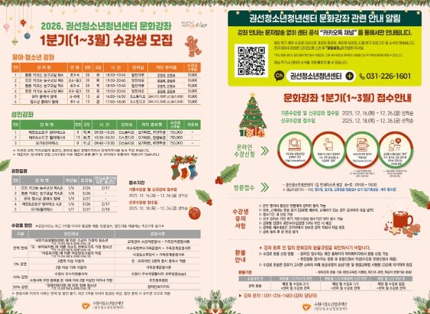 (중부시사신문) 수원시청소년청년재단 권선청소년청년센터는 오는 1월 6일부터 3월 27일까지 지역사회 평생학습 문화강좌 1분기(1~3월) 수강생을 모집한다.