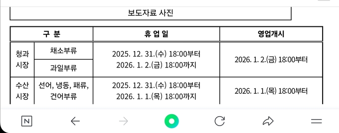 청과시장은 12월 31일 18시부터 내년 1월 2일 18시까지 휴장하며, 수산시장은 12월 31일 18시부터 내년 1월 1일 18시까지 휴장한 이후 경매가 재개된다.