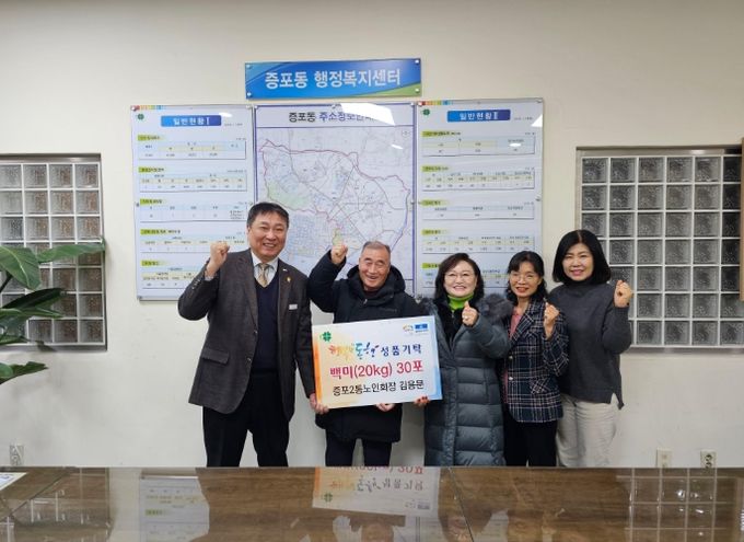 (중부시사신문) 이천시 증포동은 지난 12월 19일 증포동행정복지센터에서 증포2통 노인회 김용문 회장이 관내 취약계층을 위해 백미(20kg) 30포를 기탁했다고 밝혔다.