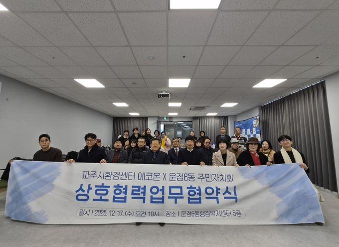 (중부시사신문) 운정6동 주민자치회는 12월 17일 오전 10시, 운정6동 행정복지센터에서 파주시환경센터 ‘에코온’과 ‘지역 환경 의제 실천 및 기후행동 협력을 위한 업무협약’을 체결하고, 이어 마을 소식지 '초롱꽃향기로' 2호 제작 성과공유회를 개최했다.