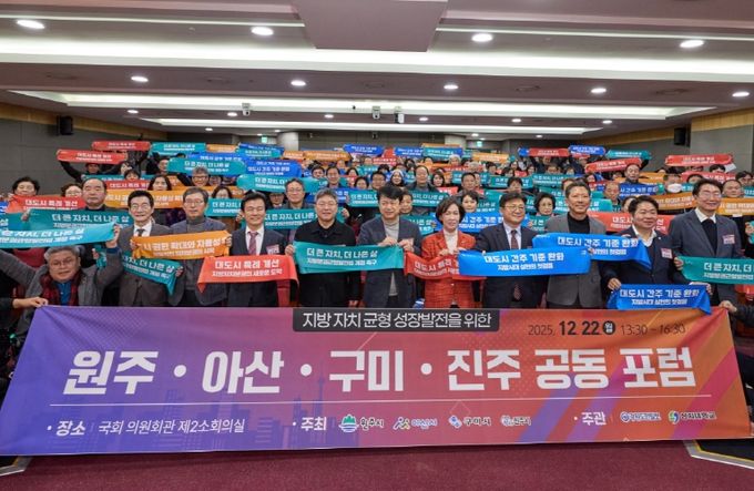 이날 행사에는 아산·원주·구미·진주시 단체장을 비롯해 지역구 국회의원과 전문가들이 참석했다. 참석자들은 지방 중추도시가 스스로 성장의 기준을 세우고, 국가 균형발전의 주체로 기능해야 한다는 데 뜻을 모았다. 개별 도시 차원의 요구를 넘어, 유사한 제도적 한계를 겪고 있는 지방 중추도시들이 연대해 제도 개선을 촉구한 공식 행동이라는 점에서 의미를 더했다.