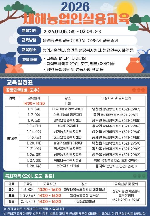 (중부시사신문) 천안시농업기술센터는 내년 1월 5일부터 2월 4일까지 ‘새해농업인실용교육’을 추진한다고 26일 밝혔다.