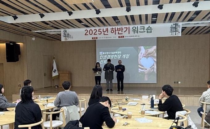 (중부시사신문) 동두천시 시설관리공단은 지난 22일 동두천 자연휴양림 세미나실에서 열린 2025년 하반기 워크숍에서 인권경영 헌장 개정 및 선포식을 개최했다고 밝혔다.