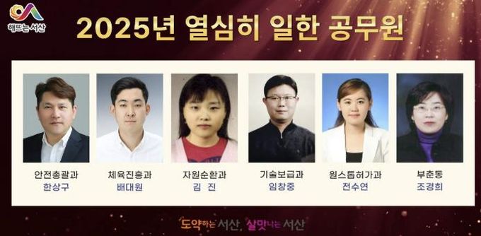 (중부시사신문) 충남 서산시는 올해 시정 발전과 시민 삶의 질 향상을 위해 노력한 공무원 6명을 ‘열심히 일한 공무원’으로 선정했다고 밝혔다.