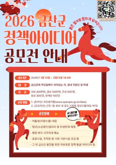 (중부시사신문) 금산군은 군정 전반에 대한 참신한 정책 아이디어를 발굴하고 군민과 함께 지역의 미래를 설계하기 위해 2026년 금산군 정책 아이디어 공모전을 개최한다.
