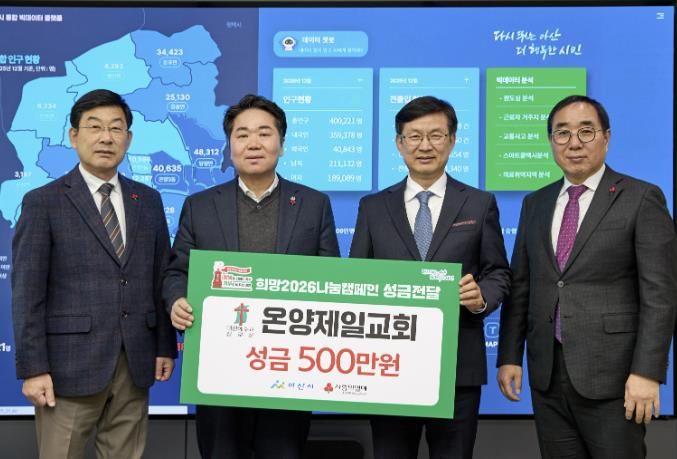 오세현 아산시장은 “온양제일교회는 오랜 역사만큼이나 지역사회를 향한 사랑을 꾸준히 실천해 온 공동체”라며 “매년 이어지는 나눔은 아산을 하나로 잇는 따뜻한 연결고리 역할을 하고 있다”고 말했다. 이어 “기탁된 성금은 교회와 교인들의 귀한 뜻을 담아 꼭 필요한 이웃들에게 잘 전달하겠다”고 덧붙였다.