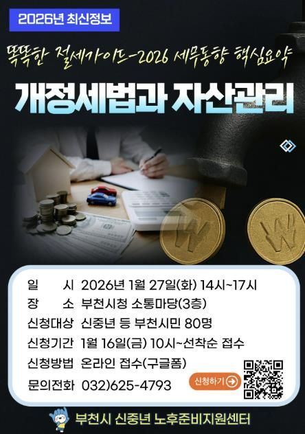 (중부시사신문) 부천시는 1월 27일 시청 3층 소통마당에서 ‘2026년 개정세법과 자산관리’ 재무특강을 진행한다. 이번 특강은 오후 2시부터 5시까지 부천시민 80명을 대상으로 무료로 진행되며, 신중년의 자산관리 역량을 높이고 안정적인 노후설계를 지원하기 위해 마련됐다.