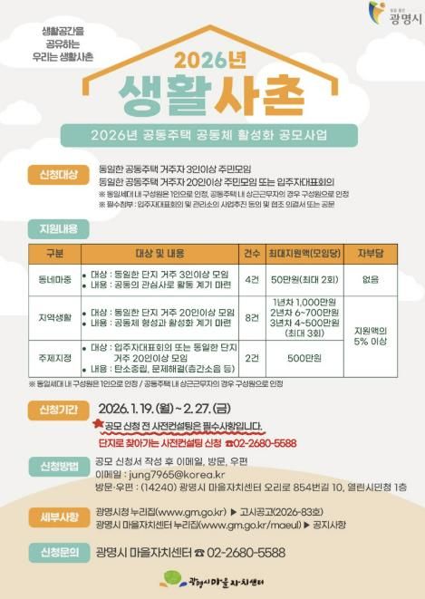 시는 공동주택 이웃 간 관계 회복과 생활권 중심 공동체 문화 확산을 위해 ‘2026년 광명시 생활사촌 공동주택 공동체 활성화 공모사업’ 참여자를 오는 2월 27일까지 모집한다.