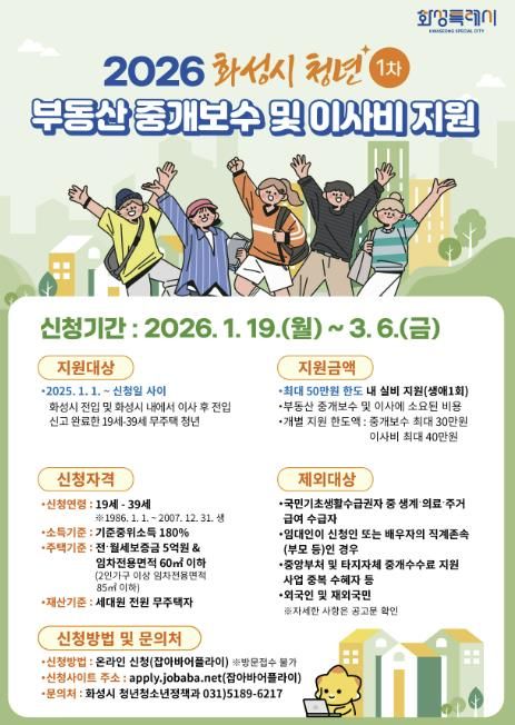 (중부시사신문) 화성특례시가 19일부터 3월 6일까지 청년들의 주거비 부담 경감 및 정주 여건 향상을 위한 ‘2026년 상반기 청년 부동산 중개보수 및 이사비 지원사업’ 신청을 받는다.