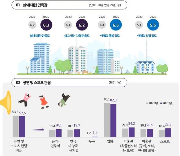 이번 결과는 2021년부터 2025년까지 삶의 만족·행복감, 여가·문화·관광 참여, 생활·안전 인식, 경제 체감 전반에서 완만하지만 일관된 개선 흐름을 보이는 점이 특징이다.
