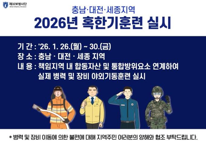 (중부시사신문) 육군 제32보병사단은 오는 1월 26일부터 30일까지 충남ㆍ대전ㆍ세종 지역에서 동계 통합 방위 작전 확립을 위한 혹한기 훈련을 진행한다.