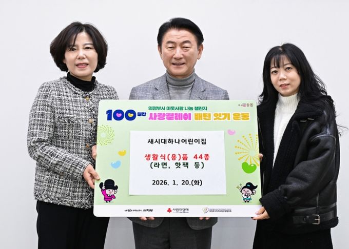 (중부시사신문) 의정부시는 1월 20일 새시대하나어린이집이 ‘100일간 사랑릴레이 배턴 잇기’에 동참해 관내 저소득층을 위한 생활식(용)품 44종(라면, 핫팩 등)을 기부했다고 밝혔다.